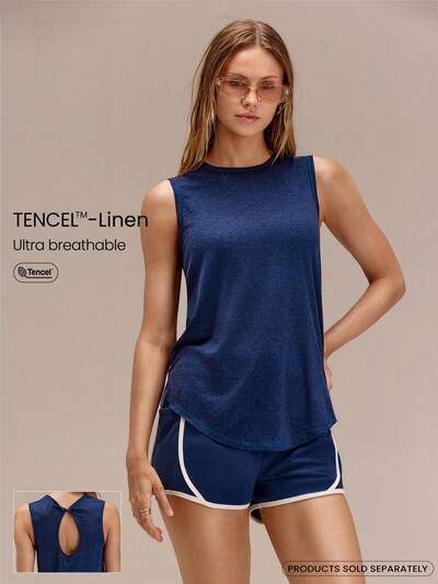 TENCEL™-Linen Max Motivation Hip Length Regular Fit A-Line Twist Cutout Crewneck Muscle Tank Vacation Holiday Summer Travel Beach Daily Casual Wear