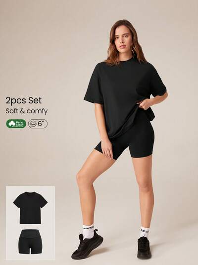 2 Pieces Pima Cotton Oversized Tee & 6" FeatherFit™ Biker Shorts Workout Set With Side Pockets Low Impact Daily Yoga Pilates Casual Spring Summer