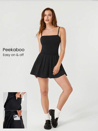 FeatherFit™-Air Peekaboo Limitless Pleated Belt Loop Square-Neck Dress With Built-In Shorts Daily Casual Removable Cups