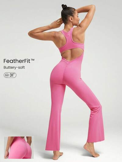 31" FeatherFit™ Racerback V-Shaped Scrunch Hip Cutout Back Jumpsuit Bodysuit Low Impact Yoga Pilates Daily