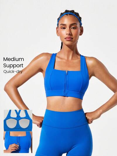 Own The Win Square Neck Cross-Back Adjustable Straps Front Zipper Sports Bra Medium Impact Running Jogging Training Gym Workout