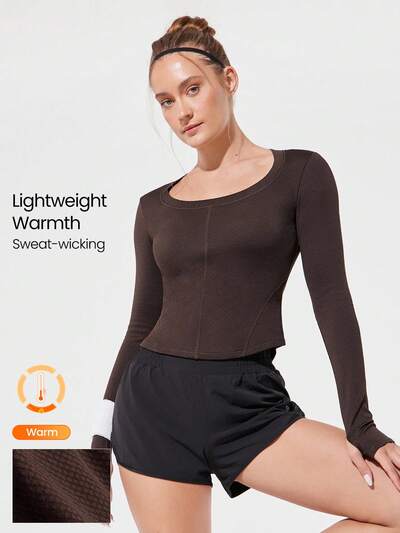 Elevate Your Energy Comfy Warm Reflective Logo Square Collar Waist Length Knit Long-Sleeve Top With Thumbholes Running Jogging Hiking Gym Training Daily Active Wear Fall Winter