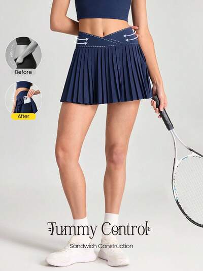 Let's Play Sweat-Wicking Stretchy Mid-Rise Crossover Waist Pleated Tennis Skirt With Built-In Shorts Side Pockets Tennis Golf Daily