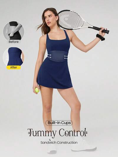 Quick-Dry Sweat-Wicking Built-In Cups Square-Neck Dress With Built-In Shorts Side Pockets Non-Slip Grips Tennis Golf Gym Daily Casual