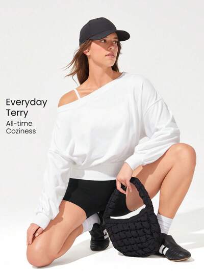Lässiger, weicher und atmungsaktiver Terry Off-Duty Schweiß ableitender Crop Slouchy Pullover mit engem Saum und Off-Shoulder für Studio, Gym, Alltag und Lässig