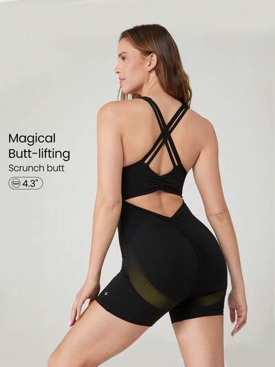 Mono/Enterizo con escote cutout, tirantes cruzados y plisado en la espalda, elevador de glúteos, copas extraíbles, apto para yoga de bajo impacto y uso diario, de 4.3" FeatherFit™-Air