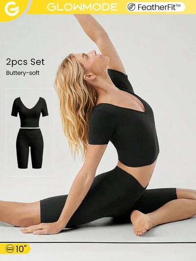 Conjunto de top corto de tirantes cruzados FeatherFit™ y shorts de ciclista con control de barriga de 4.3" para yoga de bajo impacto y uso diario