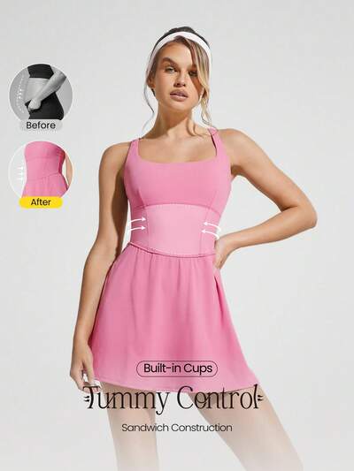 Vestido mini FeatherFit™-Air con pantalón corto incorporado, bolsillos laterales, agarre antideslizante, de secado rápido y transpirable, con espalda cruzada tipo "peekaboo", apto para yoga, pilates, y uso diario casual. Incluye copas desmontables.