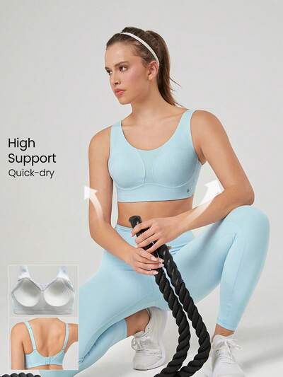 Soutien-gorge de sport avec bonnets intégrés, haute résistance aux chocs, encolure ronde ouverte dans le dos, brides réglables larges, panneaux en maille. Idéal pour le jogging, la course et l'entraînement.