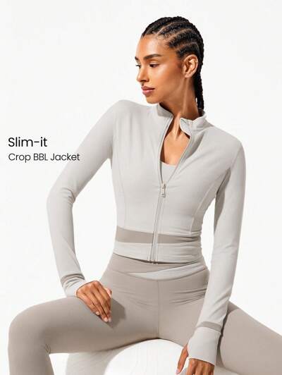 Veste FeatherFit™ Cool Crop à évacuation de la transpiration, stretch, coupe-crop avec bordures de taille bicolores, coupe près du corps sculptée, avec trous pour les pouces, fermeture éclair avec protège-cou, idéale pour le yoga, le Pilates, le barre fitness et le port quotidien décontracté