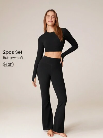 31" Ensemble 2 pièces FeatherFit™ Make A Move Activewear avec T-shirt à manches longues et leggings évasés avec trous pour les pouces, impact faible, yoga, usage quotidien, coussinets amovibles