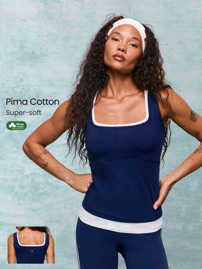 Débardeur à encolure carrée bicolore avec deux couches en coton pima doux, extensible et léger. Idéal pour le yoga, le pilates, le studio de gym et l'usage quotidien.