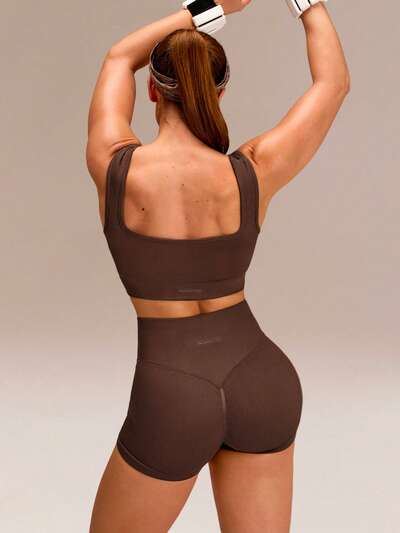 Set di reggiseno sportivo senza cuciture con scollo quadrato ultraleggero e rimovibile, con costine sotto il seno, e pantaloncini a vita alta con effetto push-up da 4,3", adatto per allenamento, corsa e palestra