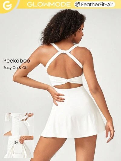 FeatherFit™-Air Peekaboo Abito con scollo a V e schiena annodata a Y con pantaloncini incorporati, yoga a basso impatto, coppe rimovibili per tutti i giorni