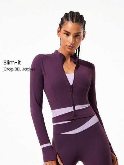 Giacca Featherfit™ raffreddata, colore a contrasto, con vita e polsini, aderente, con zip e fori per i pollici, adatta per yoga, pilates, barre e uso casual quotidiano