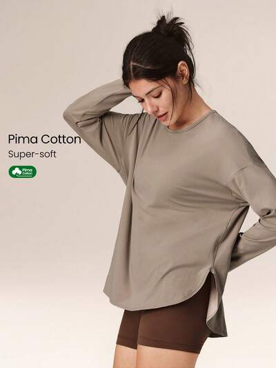 ピマコットン オーバーサイズ 長袖 スリットヘム ラウンドネック Tシャツ デイリーカジュアル