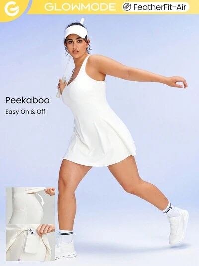 FeatherFit™-Air ピーカブーミニドレス、ビルトインショートポケット スクエアネック、アンチスリップクロスストラップ、軽量サポート、ローインパクト対応