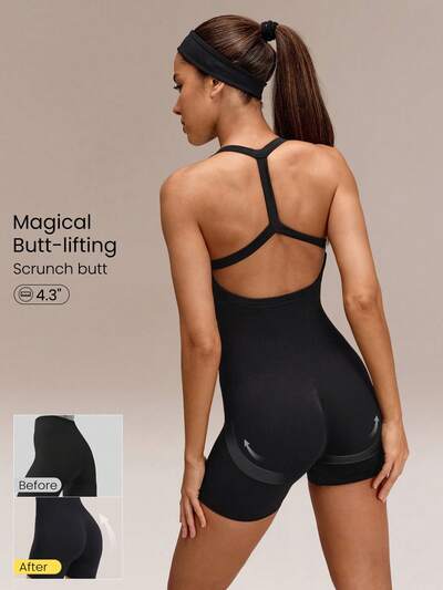 4.3" 초극세 부드러운 이음새 없는 흐름 프리 골지 허리 압축 패널 탈착식 컵 스크런치 엉덩이 리프트 레이서백 짧은 바디수트 트레이닝 러닝 짐 요가 스튜디오 데일리 액티브웨어