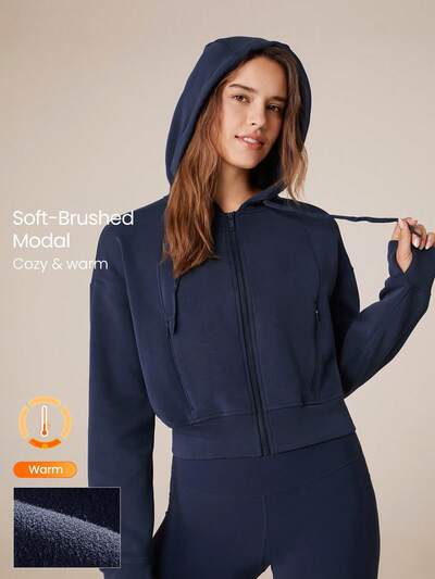 Modal Fleece Power Zip Side Pockets Hoodie Long Sleeve Sweater With Thumbholes Daily Casual