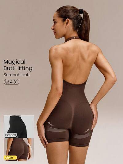 4.3" Ultrafine Soft Seamless Built To Glow Ribbed Waist Compression Panels Removable Cups Scrunch Butt Lift Adjustable Halterneck Short Bodysuit Training Running Gym Yoga Studio Daily Active Wear