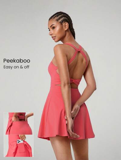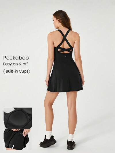 FeatherFit™-Air Made To Win Sweat-Wicking Quick-Dry Peekaboo Built-In Cups Crossover Strappy Back Scoop Neck Active Dress With Built-In Shorts Side Pockets Non-Slip Grips Low Impact Tennis Golf Pickleball Daily Wear
