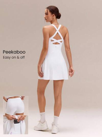 FeatherFit™-Air Peekaboo Mini Dress With Built-In Shorts Pocket Square Neck Anti-Slip Crisscross Light Support Low Impact Quick Dry Moisture Wicking Spring Summer