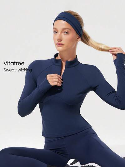 Slim Fit Warm Waist Length 1/4 Zip Knit Long-Sleeve Top With Thumbholes Running Jogging Hiking Gym Training Daily Active Wear Sweat-Wicking