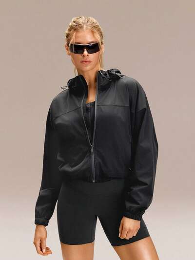 Chaqueta con capucha cortavientos ligera y suave con ribete de contraste, banda elástica ajustable, para uso diario casual, entrenamiento, running, senderismo y gimnasio de impacto medio