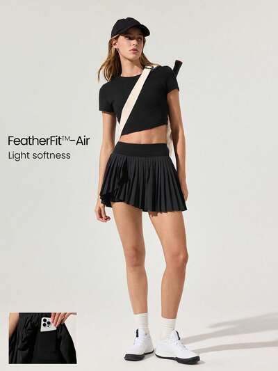 Saia Assimétrica Plissada FeatherFit™-Air com Bolso Anti-Deslizante, Shorts Embutidos, Suporte Leve, Baixo Impacto, Tênis, Golfe, Secagem Rápida, Absorção de Umidade