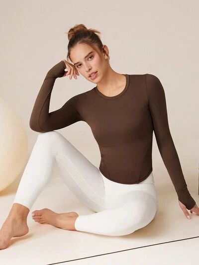 Camiseta de Manga Longa FeatherFit™ com Design Macio, Elástico e Canelado, Divisão de Costura, Baixo Impacto, Adequada para Yoga, Pilates, Uso Diário Casual, com Alças Removíveis